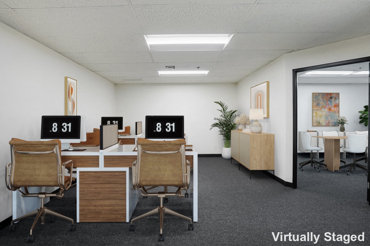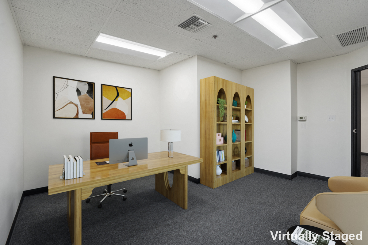 Two-story suite with a reception, large warehouse, and 2 restrooms downstairs. There is also an open area landing and 2 private window offices upstairs.